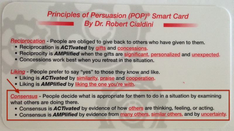 Anyway, according to my wallet-sized Principles of Persuasion card I got when I spent some time with the Influence at Work group in Phoenix a while back (that I carry with me everyday because I’m just that awesome), Consensus is when “people decide what is appropriate for them to do in a situation by examining what others are doing.”